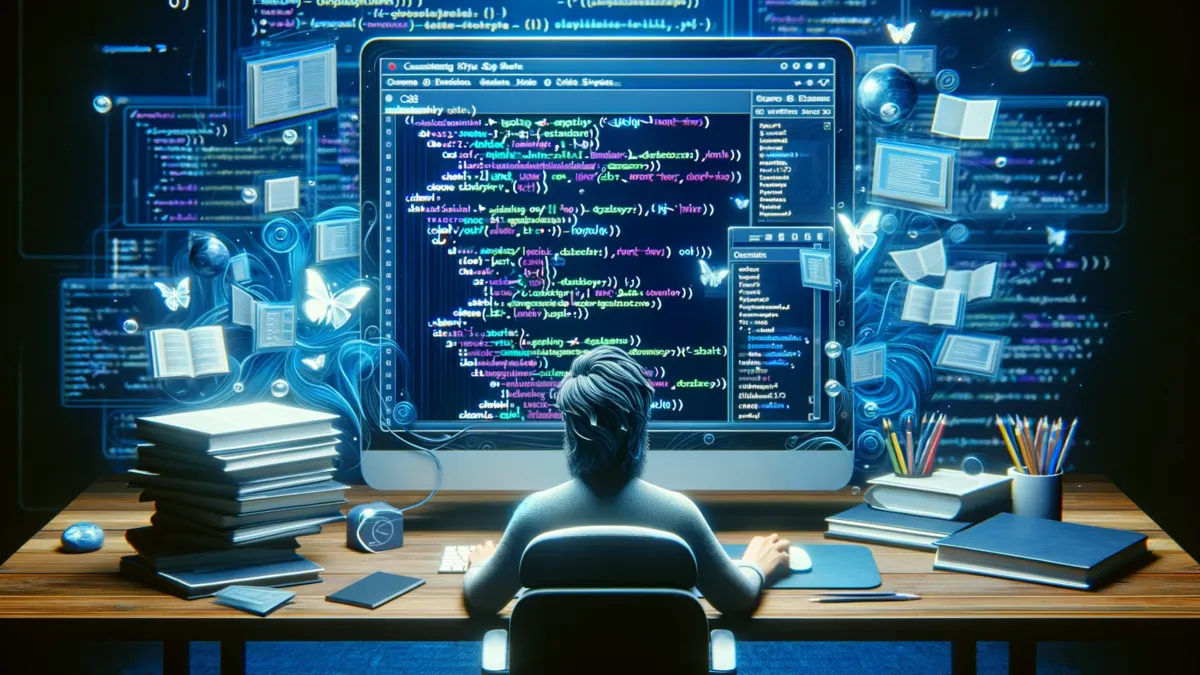 Das Bild zeigt einen Webdesigner, der an einem Schreibtisch mit mehreren Bildschirmen sitzt und CSS-Code auf einem Computerbildschirm bearbeitet. Der Bildschirm hebt verschiedene Eigenschaften und Werte des Codes hervor, was die Bedeutung von CSS im Webdesign unterstreicht.