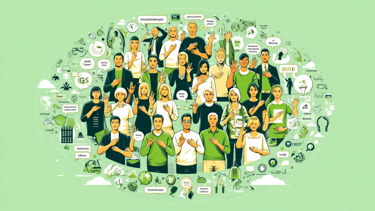 Das Bild zeigt eine Gruppe verschiedener Personen, darunter unterschiedliche Ethnien, Geschlechter und Altersgruppen, die in deutscher Gebärdensprache (DGS) kommunizieren. Sie sind von Symbolen und Texten zum Thema Barrierefreiheit umgeben. Das Bild zeichnet sich durch ein grünes Farbschema aus, welches Inklusivität und Zugänglichkeit symbolisiert. Dieses Bild wurde mit Hilfe künstlicher Intelligenz generiert.