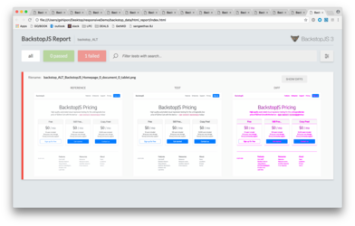 Ein Testbericht von BackstopJS, der die Preisübersichtsseite vergleicht. Links die Referenz, in der Mitte das getestete Bild, und rechts die Unterschiede, markiert in pink. Ein roter Rahmen zeigt einen fehlerhaften Test.