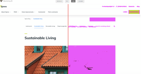 BackstopJS Vergleich mit visuellen Unterschieden: Eine Webseite im Vergleichsmodus in BackstopJS. Die linke Seite zeigt die Referenz, die rechte Seite hebt mit pinken Markierungen die Unterschiede hervor.