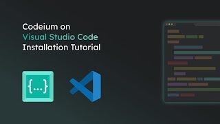 Ein Installations-Tutorial-Banner für Codeium in Visual Studio Code. Das Bild zeigt das Codeium-Logo, das VSCode-Logo und eine stilisierte Code-Darstellung. Der Text lautet: „Codeium on Visual Studio Code Installation Tutorial.