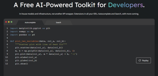 Screenshot der Codeium-Oberfläche, die Python-Code zeigt. Ein Beispiel für eine Funktion (plot_two_variables) wird mit Autovervollständigungs- und Suchfunktionen hervorgehoben. Oben steht „A Free AI-Powered Toolkit for Developers.“