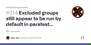 GitHub Issue #314 mit dem Titel "Excluded groups still appear to be run by default in paratest", zeigt eine Diskussion über Testgruppen-Konfiguration. Die Problemstellung ist mit einem roten X-Symbol gekennzeichnet.