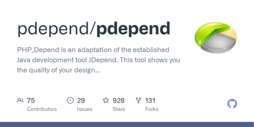 GitHub-Seite des PDepend-Projekts. Ein Tortendiagramm-Logo begleitet die Beschreibung: 'PHP_Depend is an adaptation of the established Java development tool JDepend.' Es gibt 75 Mitwirkende, 29 offene Issues, 928 Sterne und 131 Forks.