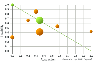 Diagramm von PDepend mit Punkten in verschiedenen Größen und Farben. X-Achse zeigt 'Abstraction', Y-Achse 'Instability'. Eine grüne diagonale Linie repräsentiert das Gleichgewicht zwischen Abstraktion und Stabilität.