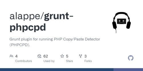 GitHub-Seite von alappe/grunt-phpcpd, einem Plugin zur Integration des PHPCPD-Tools in den JavaScript-Taskrunner Grunt. Anzeige von Nutzungszahlen, Stars und Forks.